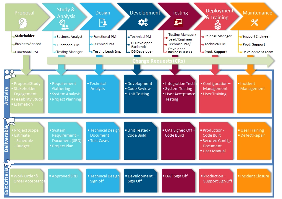 Every project commissioned undergoes all the phases of our predefined process, with each phase having certain well-defined activities, deliverables, and exit criteria. Design and Development phases are functionally internal to our organisation. In rest all other phases (Study & Analysis, Testing, Deployment & Training, and Maintenance), we work together with the business, pool in our years of collective experience both in domain and technology to deliver the best in the industry. Post-deployment and User Training the project remains under our support until the end-users fully familiarise themselves with the business application and are able to realise all the stated benefits.